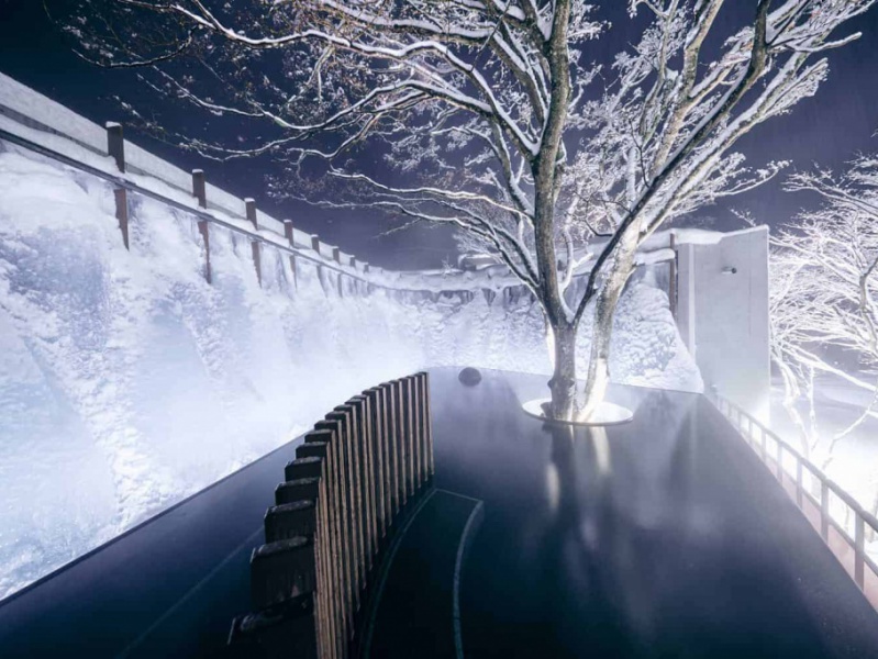 看完表演,移步到大浴場泡湯,露天溫泉飄飛著雪花,一座迷你版的睡魔燈籠浮在前方水鏡之上,彷彿來自祭典現場的笛音響起,清揚婉約的曲調劃破寧靜的雪景,沒想到就連泡溫泉也有置身在祭典舞台的奇妙感受。