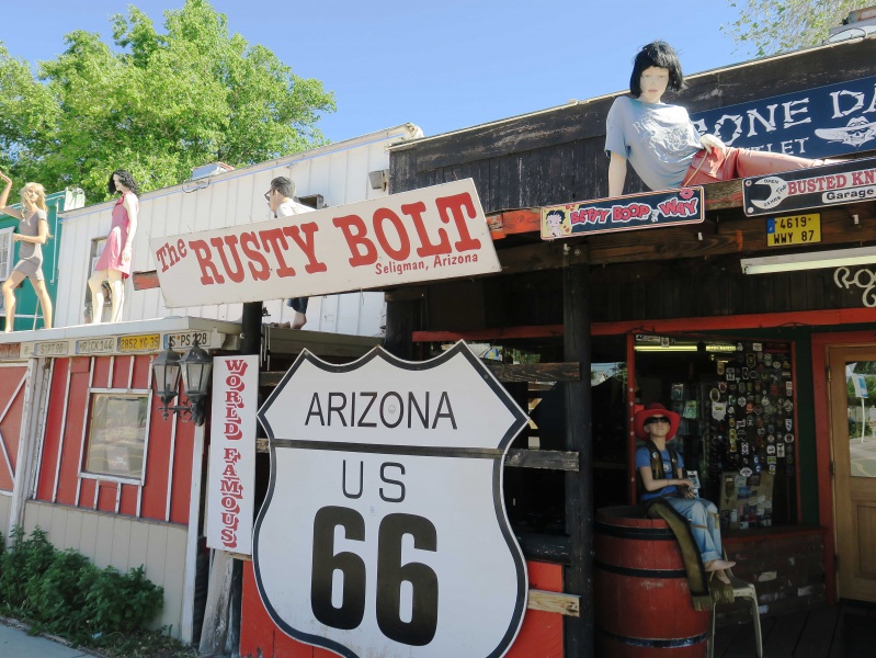 其中在19世紀末崛起的薩立格曼小鎮,是66號公路著名的歷史遺跡,也是熱門的哈雷重機旅遊地,街道上停放各式古董車款作為裝置藝術,其中無所不在的66號公路元素是其中最大的亮點;在琳琅滿目的商店街中,最知名的莫過於Rusty Bolt「屋頂上的模特兒」,由老闆精心打理時尚衣裝的造型模特兒作為屋頂上的裝飾,每一季都吸引許多66號公路迷前來拍照朝聖。