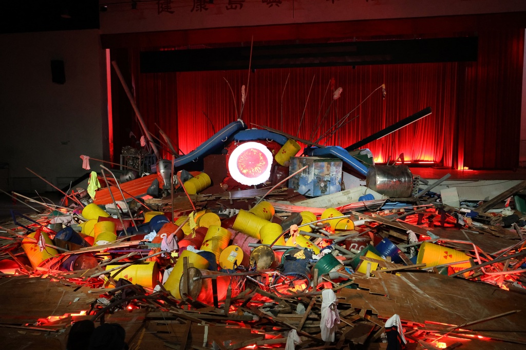 山隴排練場曾是村民出海前集合接受「精神喊話」的地方,作者用釣魚線編織出龐大的網狀裝置,打上藍色燈光如海面下的神秘黑洞,引人探尋;背後則寓意世間萬物緊密相連,以釣魚線為材也凸顯人類與海洋相互依存的關係。從四面八方看《生命之網》各有不同視覺效果,鏡面反射的畫面也相當壯觀。