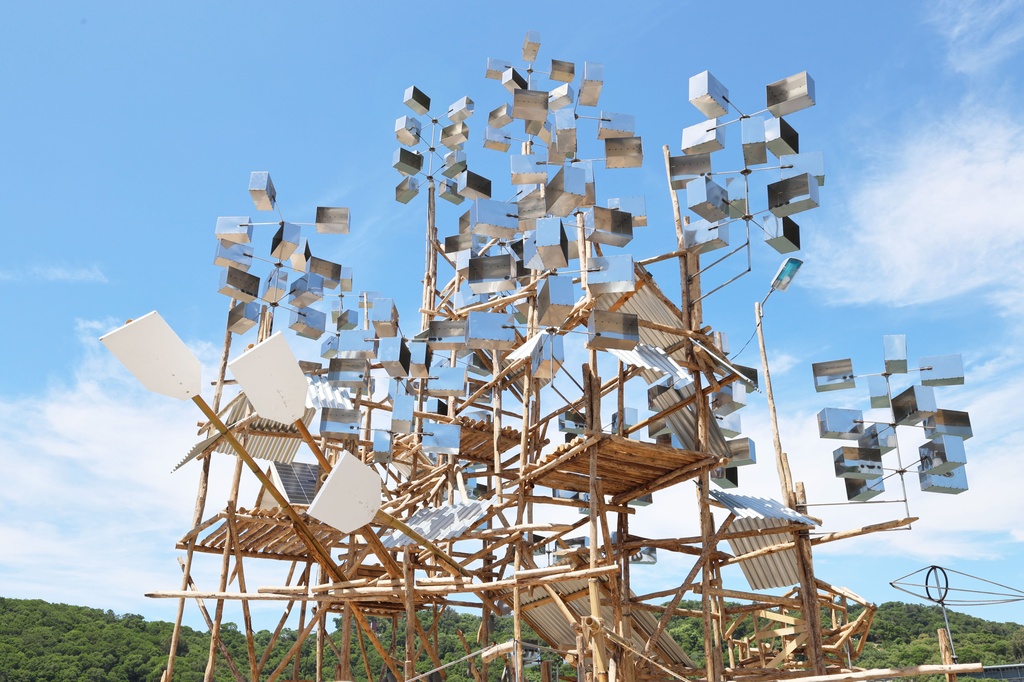 漁夢以機械動力重構馬祖漁村景象,結合太陽能與風力驅動漁網、浮球、船槳及魚型,彷佛是一座移動城堡般動能美感,更體現現在工藝與自然的對話,也是馬祖人的身體記憶積累,及故鄉的思念情懷。