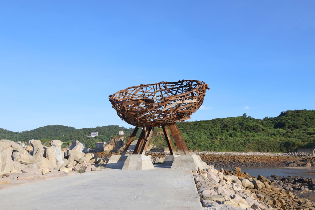 《築巢》以遠方刻有「枕戈待旦」的巨大石牌為背景,馬祖雕塑家陳益輝在海灣創作大型地景《築巢》,將過往軍事防禦工事中的「軌條砦」,轉化為馬祖人在時代動盪中求安居樂業、築起巢穴的生活想像,這不僅僅是一件雕塑,更是對生命韌性與不屈的禮贊,提醒我們無論遭遇何種挫折,都能如這鳥巢一般,在困難中重建迎來新生,完成生命的華麗轉身。